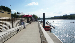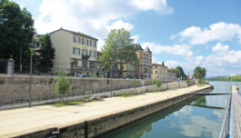 Egrenés au long d’un chemin naturel en vis-à-vis de la mystérieuse et romantique Ile Barbe, les nouveaux pontons des rives basses de Caluire offrent aux trois clubs d’aviron lyonnais de confortables accès directs au plan d’eau. L’ancienne écluse, accessible aux promeneurs par une nouvelle rampe s’anime comme une véritable place publique, autour d’un restaurant flottant et des pénichettes de tourisme fluvial. Elle se décline en tapis vert et terrasses de pierres pour la détente et activités.