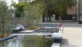 Sur la rive ouest, le recul du troisième rang d’arbres permet de glisser au droit des discontinuités bâties une série de petits espaces de repos plantés de pins. En effet, contrairement à son vis à vis qui présente une continuité, la façade Ouest est séquencée par des vides qui s’ouvrent sur les intérieurs d’îlots. Ces bouquets d’arbres persistants s’associeront à ceux du Mail pour constituer des masses très présentes dans la perspective.En pied du mur, les dalles de pierres qui longent les façades se creusent en forme de bassin pour recueillir les eaux de fontaines jaillissant de la paroi. . Au droit des fontaines un des linéaires d’étals s’interrompt ponctuellement. Ces espaces forment au cœur de la densité du marché autant de petites placettes agréables pour s’arrêter et se retrouver.