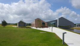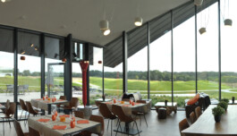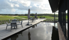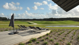 A la fois ouvert sur les paysages du golf et protégé du vent, le club house s’organise en hameau, tel une ferme cauchoise. Habillés de zinc et de bois, les bâtiments offrent des transparences lumineuses vers le golf et ses longues perspectives aériennes.