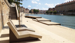 Dans l’espace patrimonial du Défilé, la promenade se glisse au fil de l’eau, au cœur de l’écrin magnifique des façades architecturales et des abruptes collines lyonnaises. Elle est rythmée par la succession des rampes et des escaliers, par une ponctuation de jardins linéaires baptisés traits verts, et par les invitations au rêve de l’artiste Tadashi Kawamata.